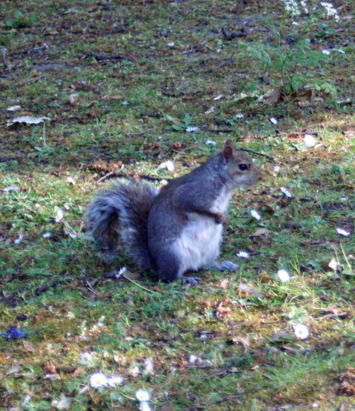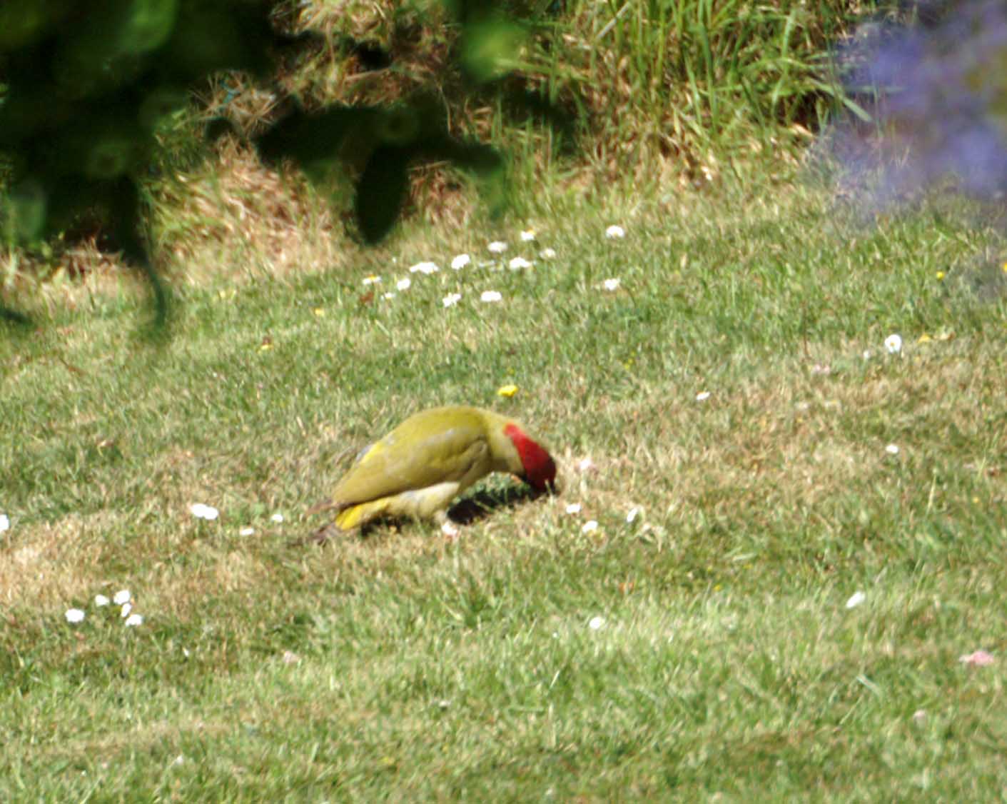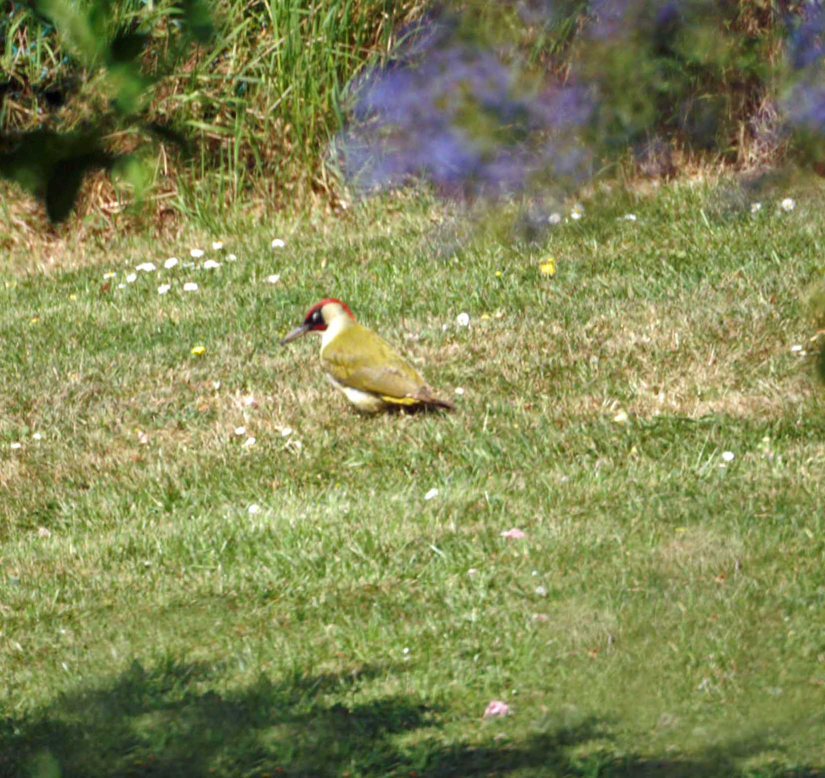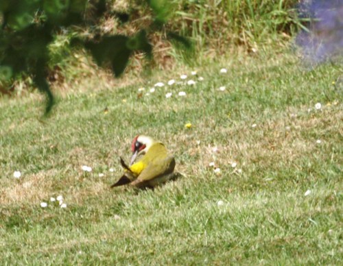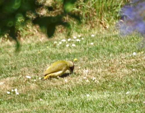 From the back of the house are views over open green fields, large mature gardens and large old trees that help support what appears to be a diverse population of wild birds. There are plenty of pigeons of course, magpies, crows and collared doves, but I saw or heard smaller songbirds too, including blackbird, blue tit, great tit, chaffinch, goldfinch, greenfinch, wren and robin. Spying over the neighbouring gardens I was thrilled to see a lovely Green Woodpecker that had flown down onto a lawn and was probing for ants. It must have found a good supply as it was there for some time.