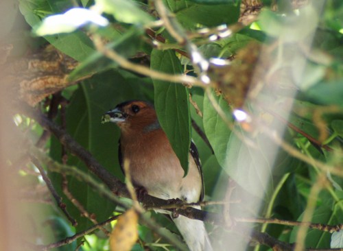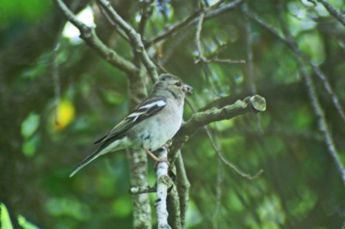 I can’t see into the Chaffinch nest from my vantage of the bathroom window, so I am not sure when the chicks hatched, but I have been able to hear them for a few days. Taking a peek out of the window today I watched as the  female brought in food and caught sight of little heads with straggly down, tiny wings with feathers being stretched and big white gapes bobbing up that just reach the rim of the nest, so they must already be about a week or so old.