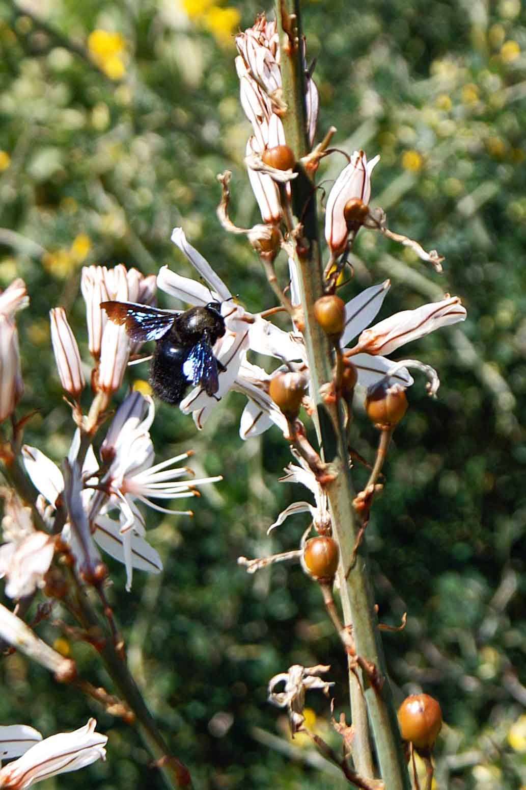 Common Asphodel showing fruits and a visiting Violet Carpenter Bee