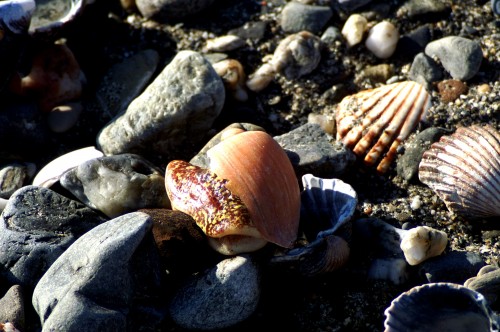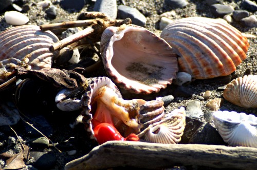 A lot of pebbles have been dredged up from the seabed and piled up in places to cover a lot of the previously sandy beach. Large numbers of cockle shells have also been thrown up and mainly scattered randomly along the sea edge, but in a few places there are piles of them. Some were evidently alive when wrenched from their rocky homes and now the poor dead animals await being eaten by gulls or flies. It’s quite a gory sight to see them like that, but its surprising how differently we view them when they’re cooked and on a plate!