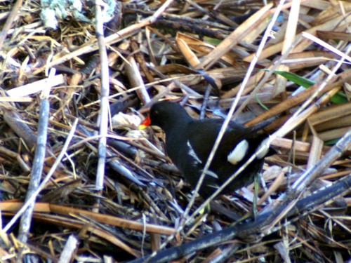 A pair of Moorhen emerged from the cover of the reeds at the water’s edge to investigate the area in front of the hide. They too are in their breeding- best now, with glossy, colourful plumage and bright shiny yellow-tipped red beaks.