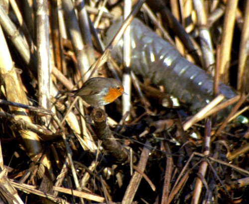 A beautiful Robin appeared from low down amongst the reeds to perch on an old cut stem and a handsome male Black Redstart flew in to take up a higher viewpoint; both had their feathers well fluffed out against the chilly breeze.