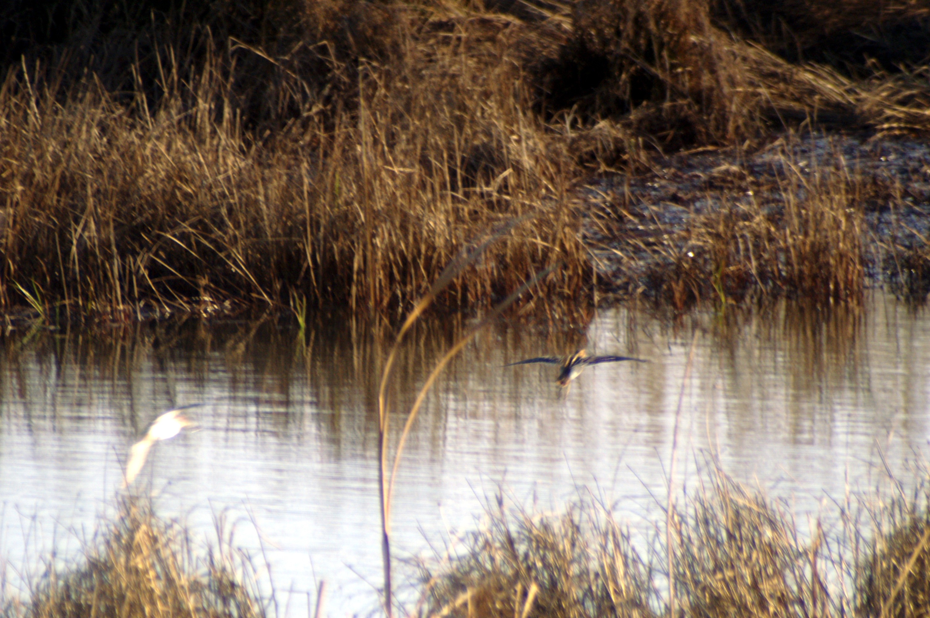Breaking the peace, a flock of about ten or so Snipe flew in fast and explosively, scattering themselves and rapidly settling into various spots around the edges of the water, where perfectly camouflaged, they effectively disappeared from view in seconds. From over the top of the hide, almost simultaneously with the Snipe, a Marsh Harrier swooped over the water, landing in on a low shrub a short distance away in the midst of the long reeds; maybe chasing the snipe? Surprised, I didn’t even think to grab my binoculars. I watched and waited for quite a while to see if it would move again, but it seemed content to stay put.