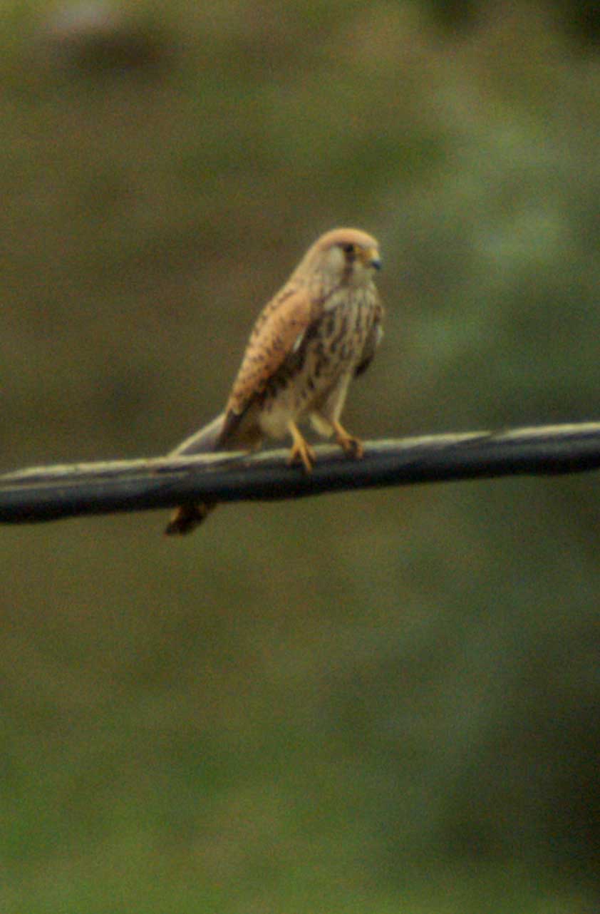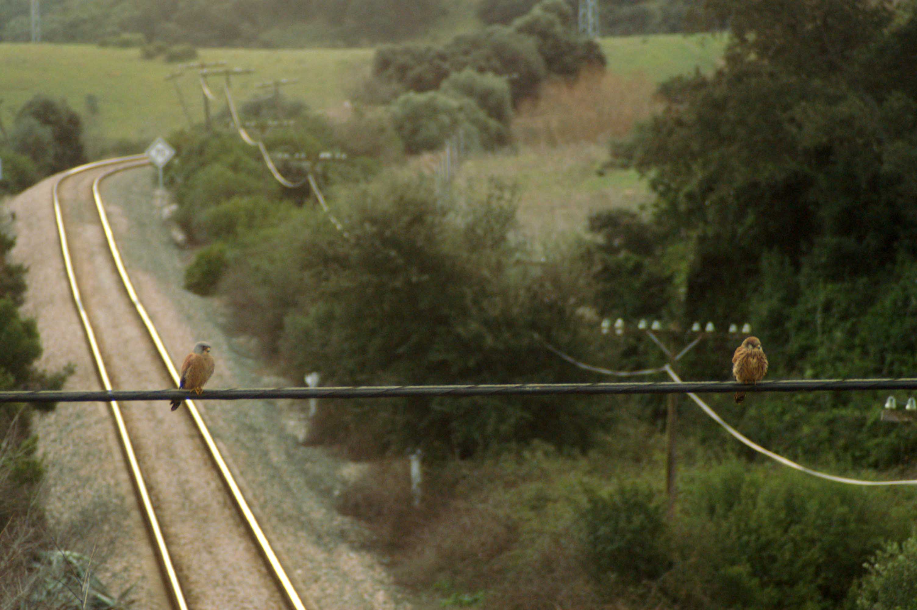 This is often a great place to get close-up views of Griffon Vultures that sometimes may be just a few metres above your head, although there were none to be seen today. We have also had good sightings of Blue Rock Thrush and Crag Martins are resident here but spend the winter months lower down nearer the coast; they’re not back yet, but doubtless will return very soon. In the front wall of the castle (sorry, hotel) are numerous holes, many of which are occupied by pigeons, but some are historically the nesting sites of a small colony of Lesser Kestrels. Prior to the breeding season it is possible to catch sight of these beautiful little raptors around the railway bridge on the A-450 that is located just before the turning to San Enrique and almost adjacent to the bridge that crosses the river Hozgarganta; we believe they must be from the colony that breeds up at the castle. The bridge is a tricky place to stop to look over its edge as the road is fairly constantly busy, but there is a track to one side that you can pull in to and then walk from. I was lucky one February morning: I left home early to pick up my friend from Jimena and as I was driving a 4 x 4 that is higher up than a ‘normal’ car, I could see over the parapet that two kestrels were sitting on the power cables that cross the railway track. There was very little other traffic, so I managed to stop and take some quick shots from inside the car.