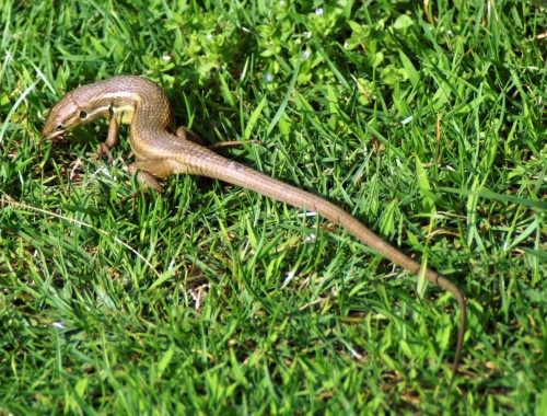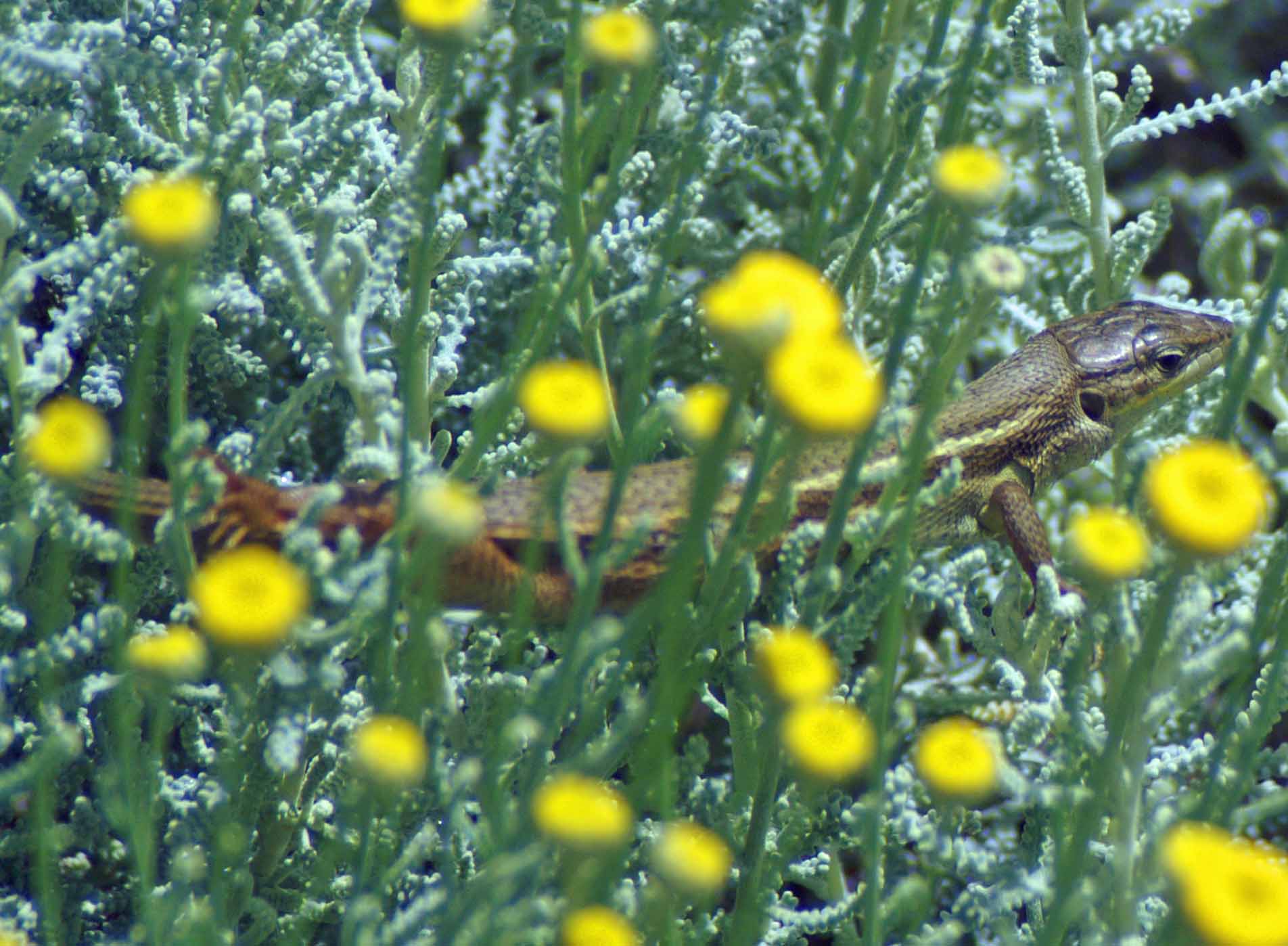 We are generally fortunate to have Psammodromus lizards living within or very close to our garden and I see them fairly fequently, particularly during the spring and early summer. One individual has been seen regularly for several years now, around the area in front of our terrace where it occasionally venture out from beneath the santolina shrubs there to hunt on the grass or up through the shrub itself and the taller cypress behind it.