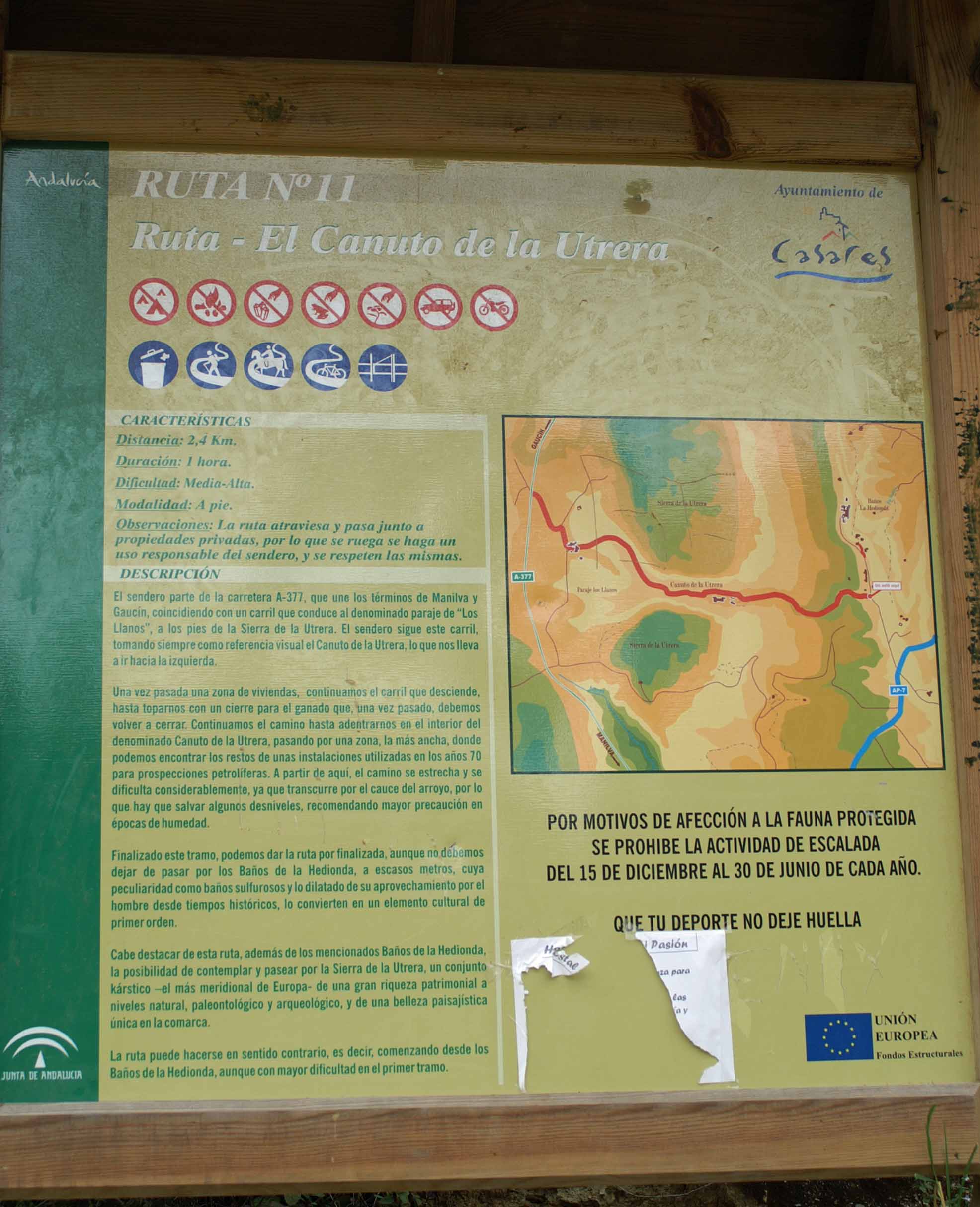 Continuing along the main track until it turns sharply to the left and then right, then on your left you will see a signboard marked ‘Ruta No11’, Ruta- El Canuto de la Utrera at the bottom of a track (describing the route in Spanish). This is the beginning of a peaceful and scenic trail along the valley that passes through the Sierra de Utrera that roughly follows the usually dry bed of a stream.