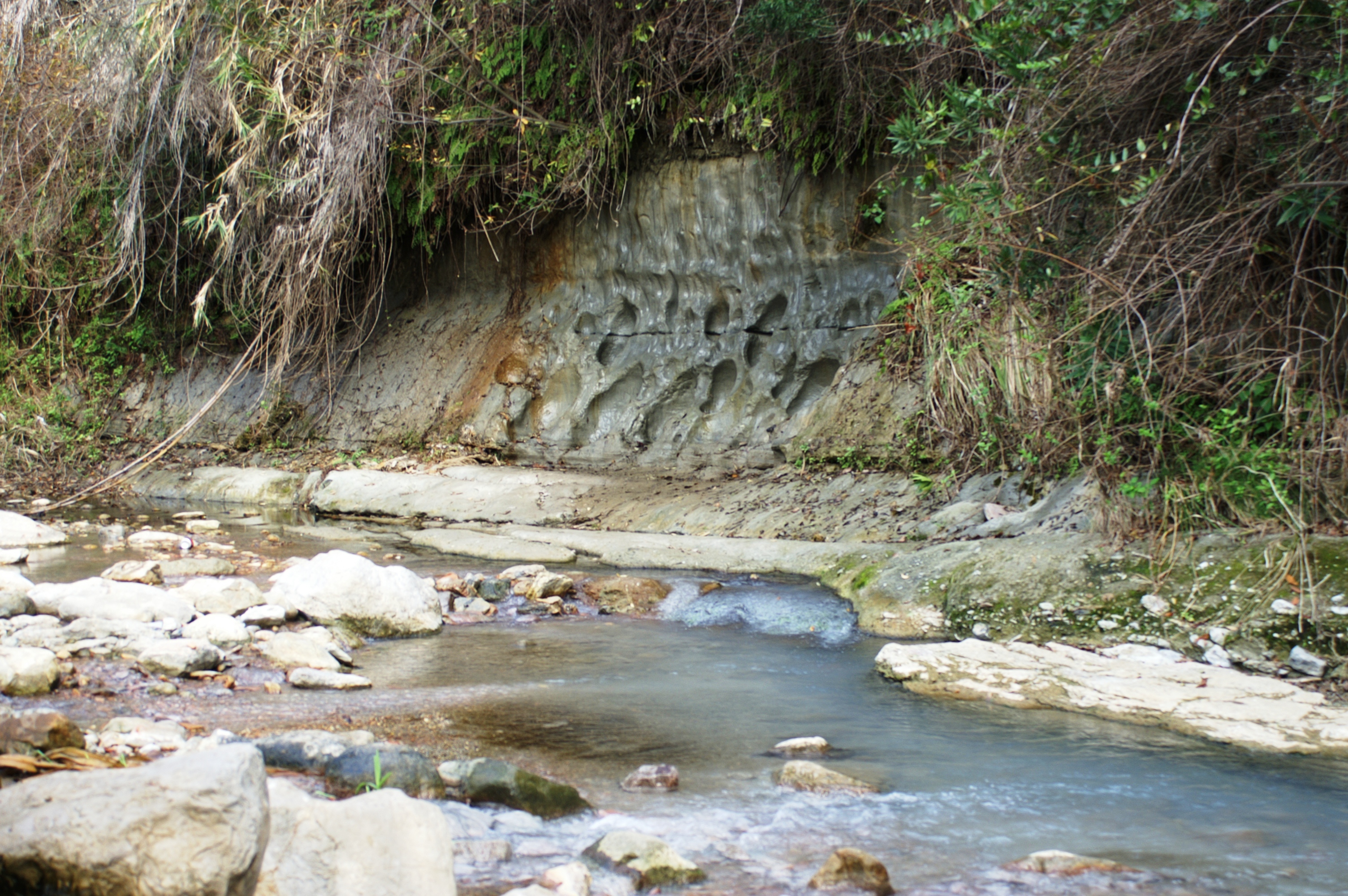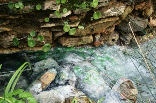 The curiously milky grey-green water exits the building beneath the floor of the enclosed ‘patio’ area flowing rapidly. It tumbles over a small weir constructed of large marble stones, then a few metres further on it meets up with the river on a bend in its course. Here there is another curiosity; a bank of grey-green mud which people dig out with their hands and smear over their bodies before entering the baths, presumably as an added source of minerals.