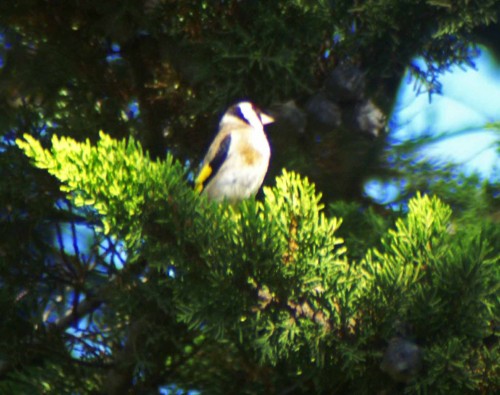 15/6/11-A goldfinch enjoying a moment in the sunshine,perched on the cyprus tree