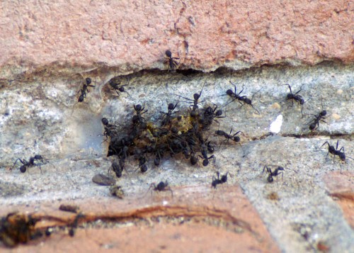 Returning from a wander around the garden, our attention was diverted to the ground by the sight of a mass of ants labouring to haul a butterfly chrysalis across the terrace. Back at the nest entrance they spent some time attempting to force the bulky prey in through the narrow crack in the cement between bricks, turning it this way and that to no avail.