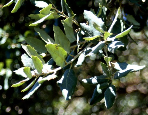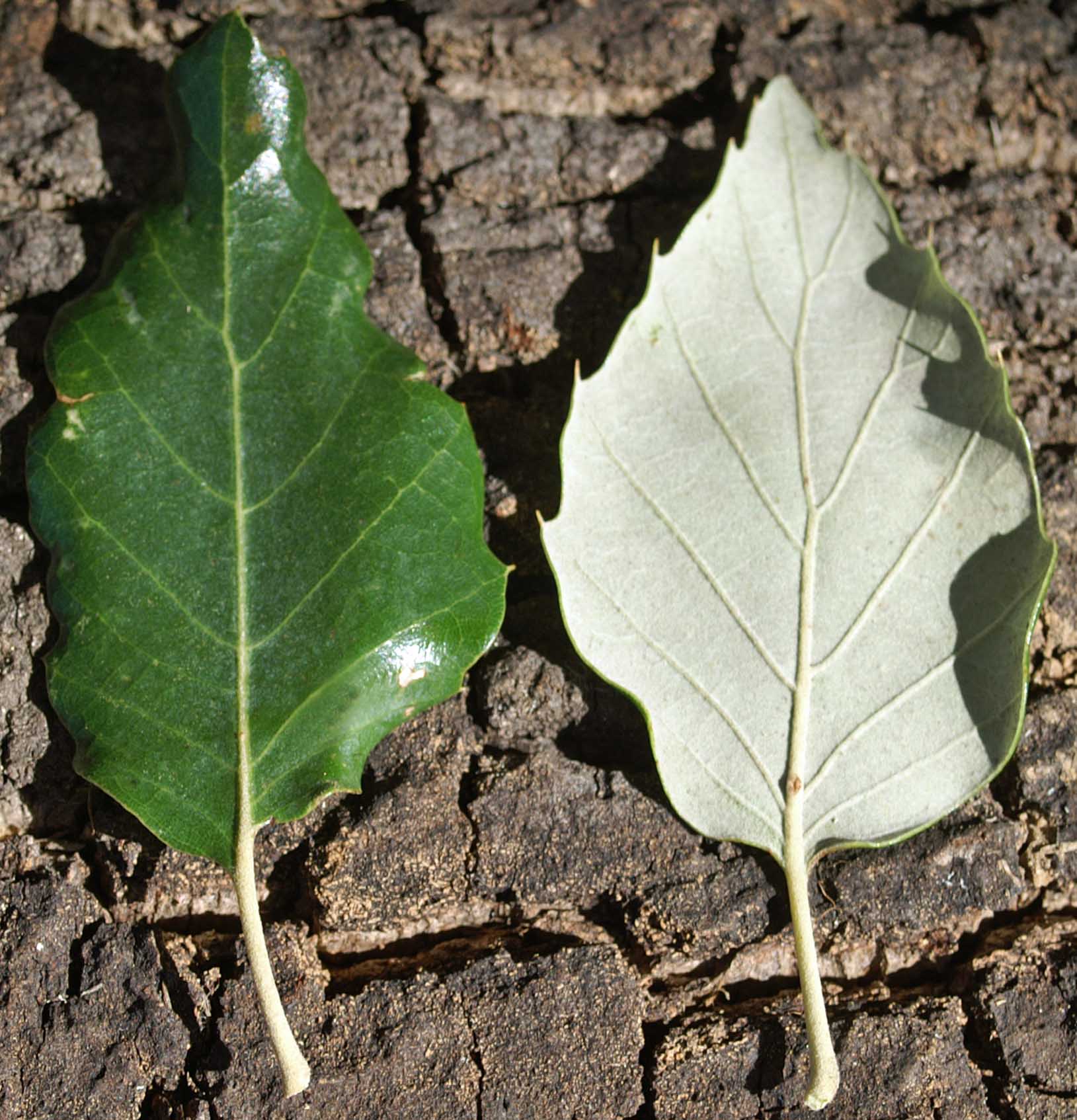 The leaves are tough and leathery; dark green above, grey and downy beneath and toothed.